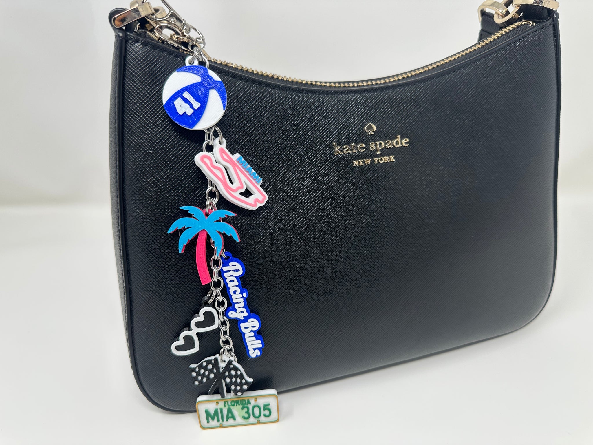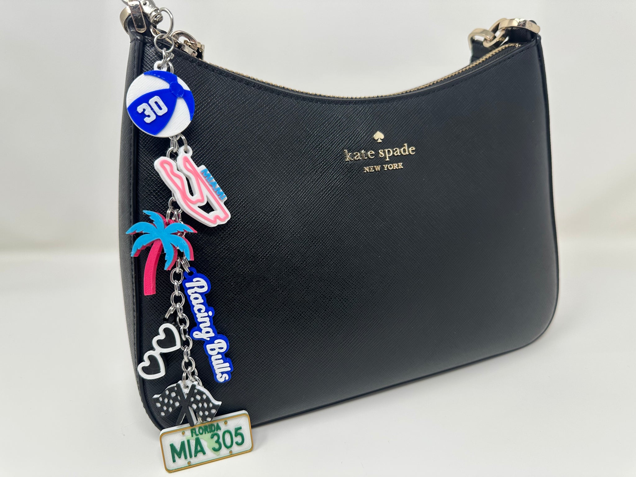 Bring the heat of Miami race weekend wherever you go. The bag charms contains 7 3D printed charms. These bag charms/key chains are designed and assembled by me. This product is inspired by racing teams and motorsport culture, but is not affiliated with or endorsed by any official racing team or drivers.