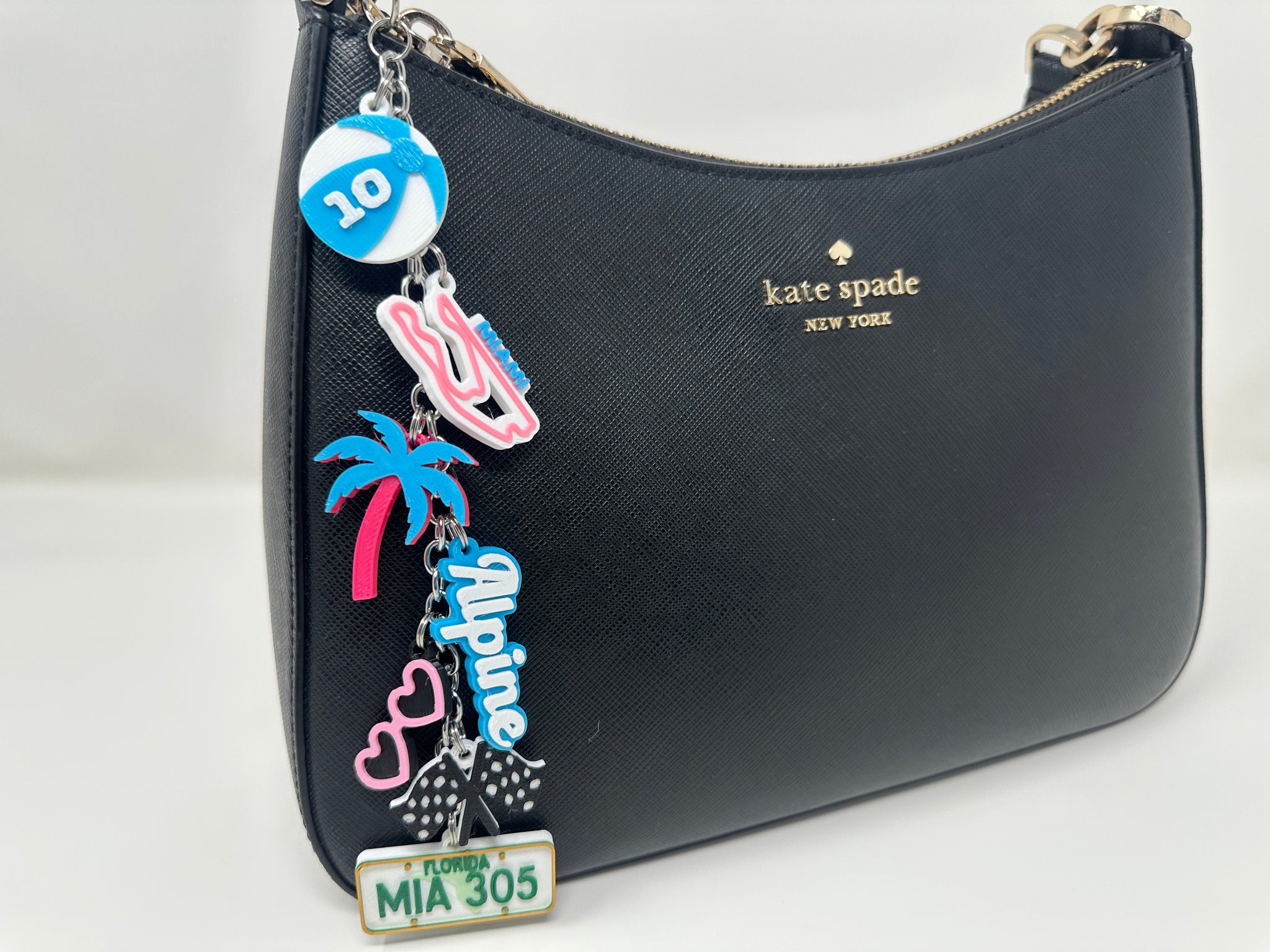 Bring the heat of Miami race weekend wherever you go. The bag charms contains 7 3D printed charms. These bag charms/key chains are designed and assembled by me. This product is inspired by racing teams and motorsport culture, but is not affiliated with or endorsed by any official racing team or drivers.